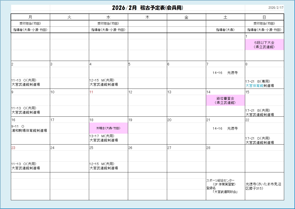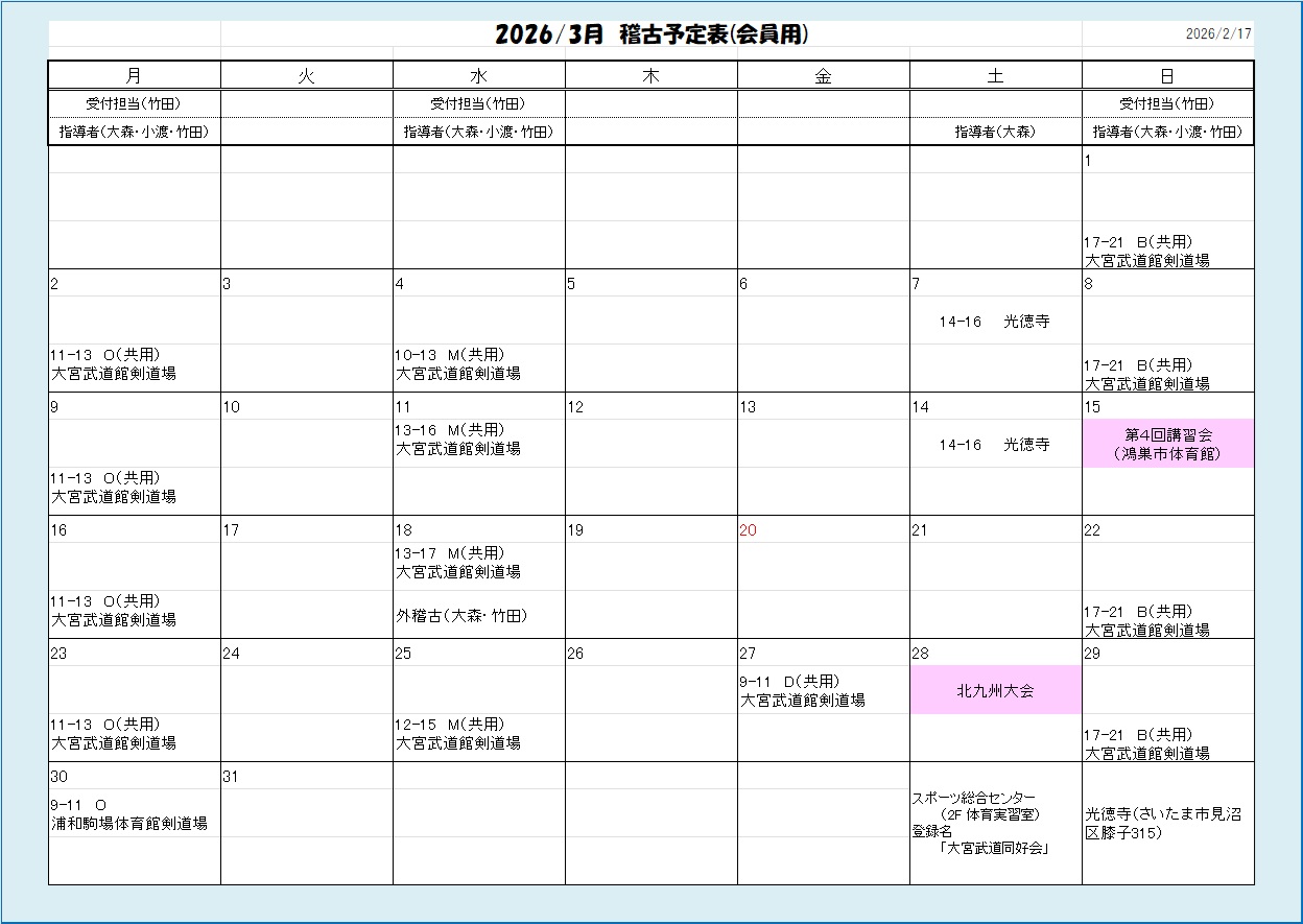 稽古日程と場所は以下の予定表をご確認下さい
